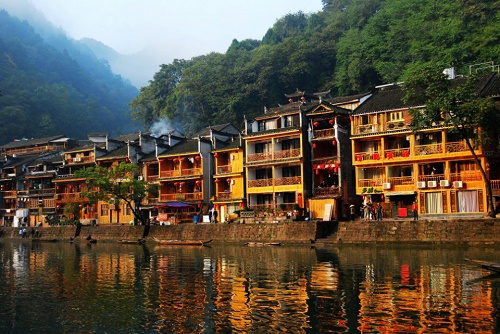 之后我們可以自由漫步在明清風格的小石板街上,隨著飄來的姜糖味,步入那名俗一條街,你會感受到苗族人生活特色,滿街精致的銀飾,湘西獨有的純陽之物朱砂,還有竹器,葫蘆絲的美妙音樂讓你如癡如醉,再嘗嘗當地的特色小吃,保證終生難忘,最后沿著沱江向下走,乘坐別具特色的【農家游船】,在歡聲笑語中我們慢慢離開這座山中有水,水中有山,山中有城的詩情畫意的小城,結束鳳凰古城的休閑之旅! |